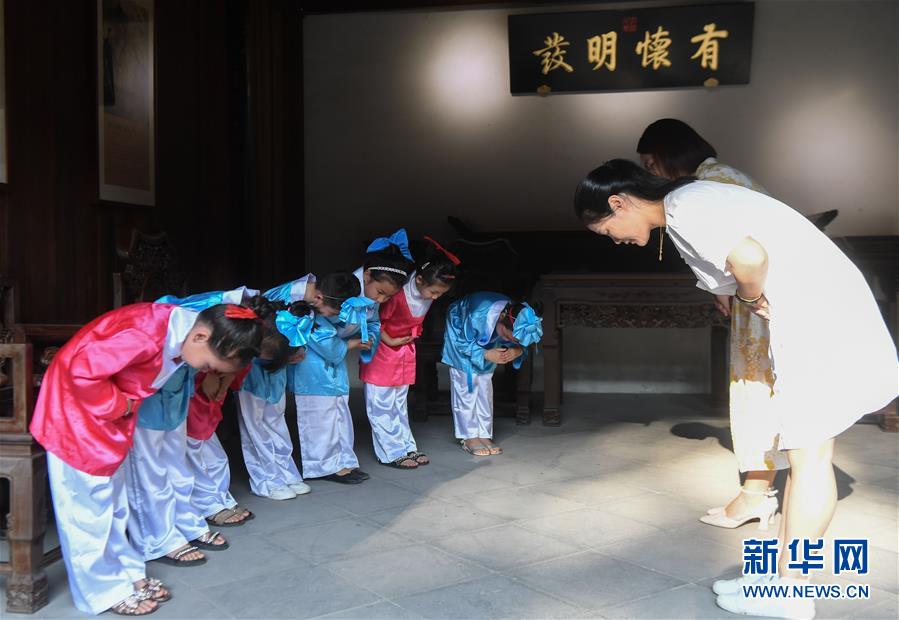 8月19日,在环山乡诸佳坞村文化礼堂里,孩子们参加入学前的开蒙礼。 今年暑期,浙江省杭州市富阳区环山乡的党员志愿者和巾帼志愿者,依托多个新近改造完成的村级文化礼堂办起暑期“爱心托管班”,为孩子们辅导暑期作业,同时还开展篆刻、音乐、游泳等兴趣活动,解决村民的后顾之忧。 新华社记者 徐昱 摄