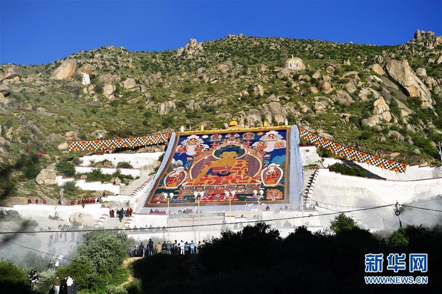 这是8月19日在拉萨哲蚌寺展佛仪式上拍摄的巨幅唐卡。 当日,随着哲蚌寺展佛仪式的开始,拉萨迎来一年一度的传统节日雪顿节。 新华社记者 詹彦 摄