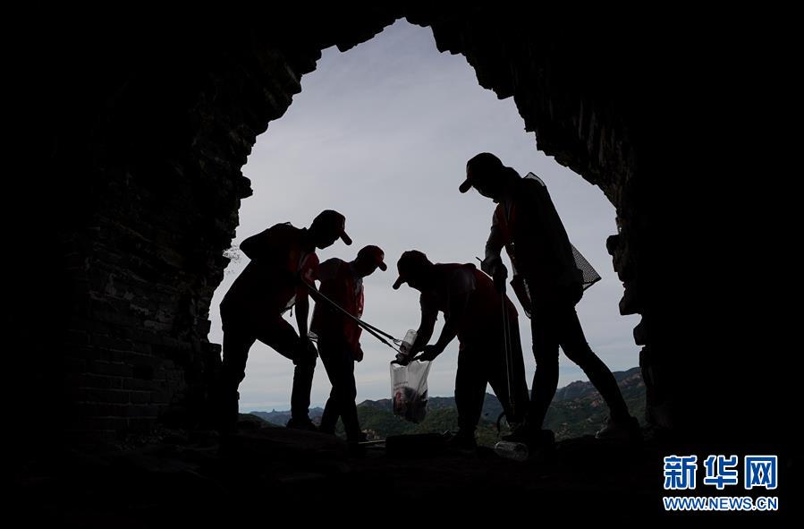 8月20日,秦皇岛阳光义工公益服务中心的志愿者在正冠岭长城捡拾垃圾。 河北秦皇岛阳光义工公益服务中心自成立之初就把清洁长城作为一项重要任务,定期组织志愿者清理长城沿线的垃圾,已坚持志愿行动18年。 新华社记者 王毓国 摄