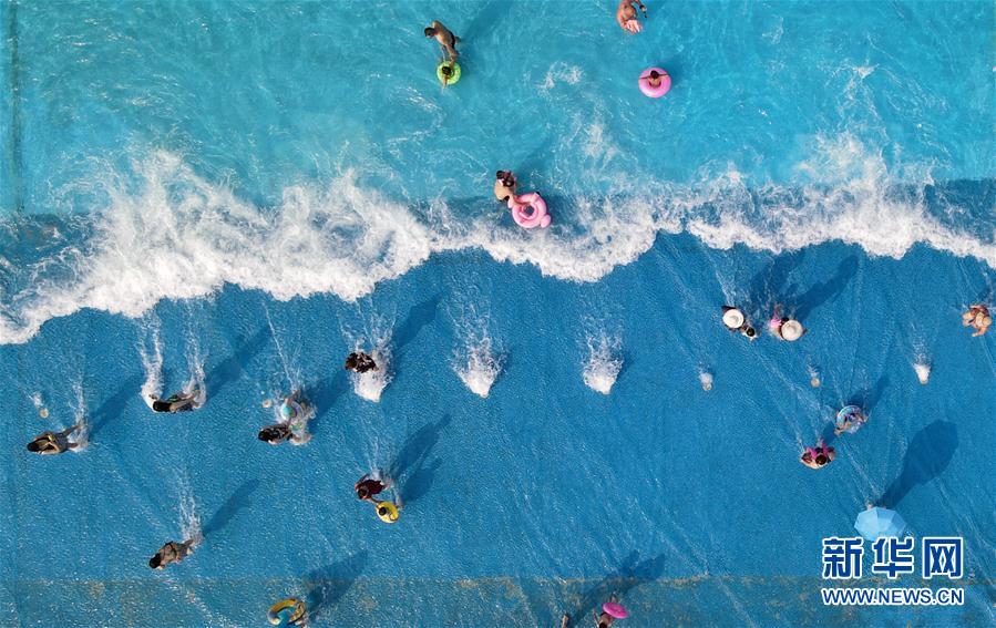 8月20日,游客在江苏省扬州市水上乐园戏水消暑(无人机照片)。 江苏省扬州市持续高温天气,“秋老虎”发威,市民和游客来到市内水上乐园,与水为伴、乐享清凉。 新华社发(孟德龙 摄)