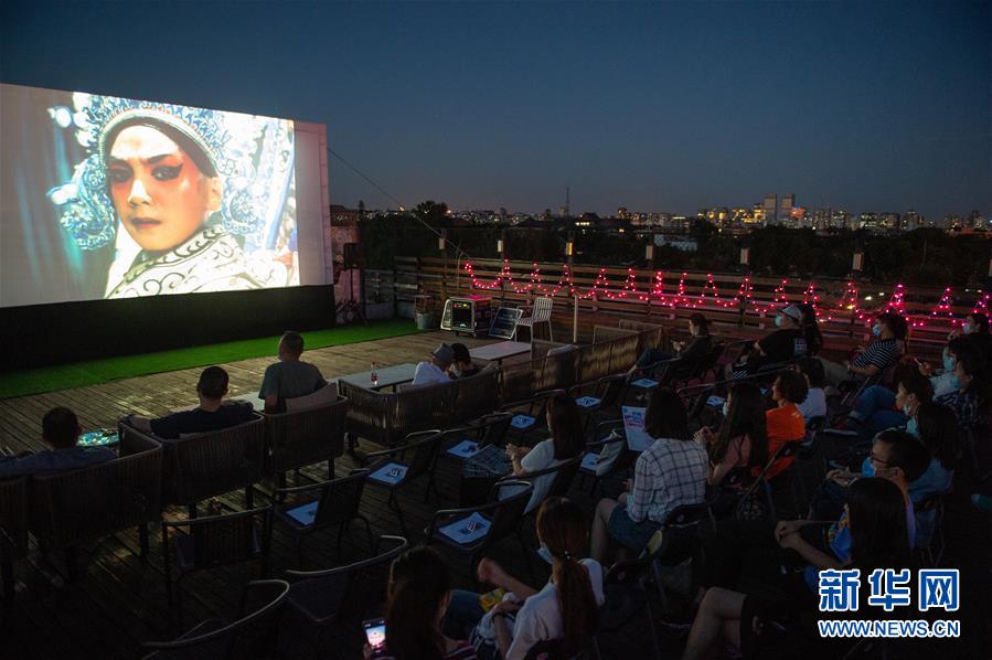 8月24日,观众在南锣书店露台欣赏露天电影。 新华社记者 陈钟昊 摄