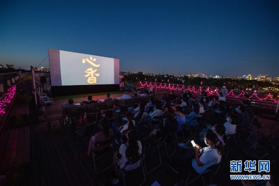 8月24日,观众在南锣书店露台欣赏露天电影。 新华社记者 陈钟昊 摄