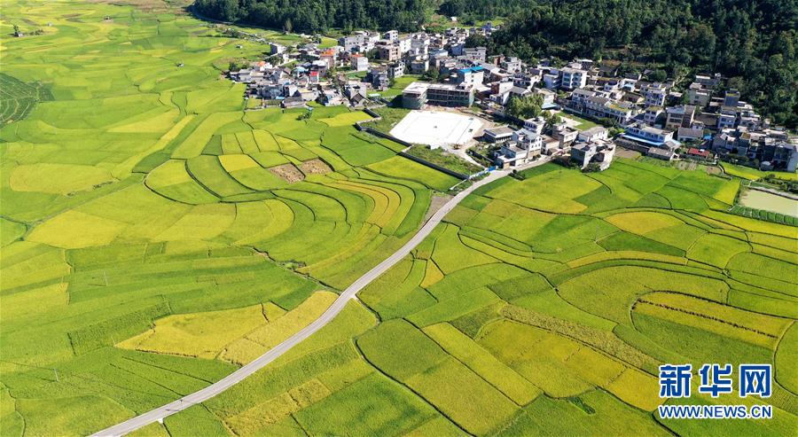8月26日拍摄的贵州省安龙县招堤街道海庄村的稻田景色(无人机照片)。 新华社发(刘朝富 摄)