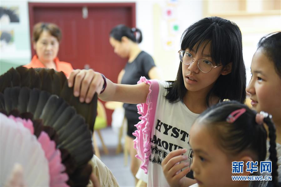 8月26日,青少年近距离观察羽毛扇细节。 当日,浙江省湖州市湖东街道组织辖区内青少年在社区活动中心手工羽扇工作室,了解羽毛扇制作技艺,学做羽毛扇,作为礼物送给父母。 新华社记者 翁忻旸 摄