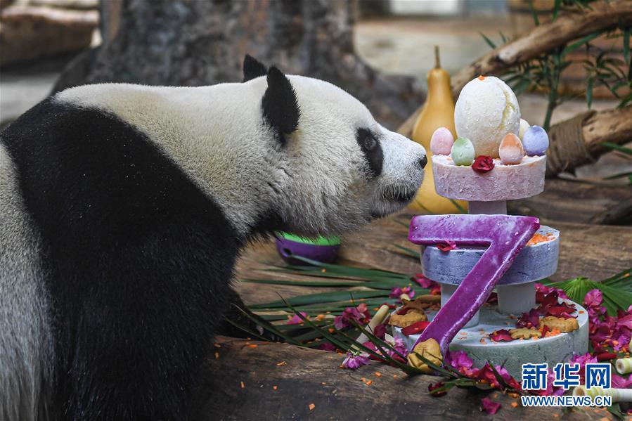 8月27日,在海南热带野生动植物园,大熊猫“舜舜”在享用生日蛋糕。 当日,位于海口的海南热带野生动植物园为园内大熊猫“贡贡”和“舜舜”举行7岁生日庆祝活动。工作人员用冰块、竹笋、水果、窝窝头等食物做成生日蛋糕和美食,为它们庆生。 新华社记者 蒲晓旭 摄