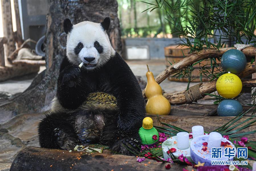 8月27日,在海南热带野生动植物园,大熊猫“舜舜”在享用美食。 当日,位于海口的海南热带野生动植物园为园内大熊猫“贡贡”和“舜舜”举行7岁生日庆祝活动。工作人员用冰块、竹笋、水果、窝窝头等食物做成生日蛋糕和美食,为它们庆生。 新华社记者 蒲晓旭 摄