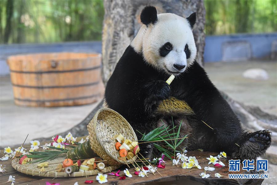 8月27日,在海南热带野生动植物园,大熊猫“舜舜”在享用美食。 当日,位于海口的海南热带野生动植物园为园内大熊猫“贡贡”和“舜舜”举行7岁生日庆祝活动。工作人员用冰块、竹笋、水果、窝窝头等食物做成生日蛋糕和美食,为它们庆生。 新华社记者 蒲晓旭 摄