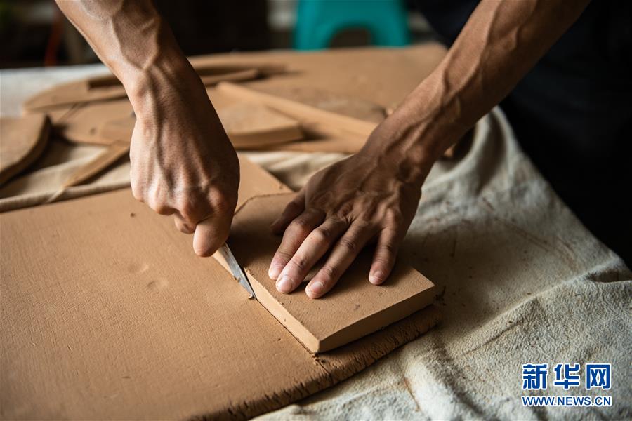 黄简松在切割陶土(8月28日摄)。 新华社记者 陶亮 摄