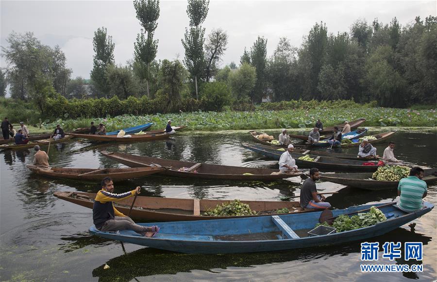 9月1日,在印控克什米尔斯利那加,商贩来到水上蔬菜市场等待交易。 新华社发(贾维德·达尔摄)