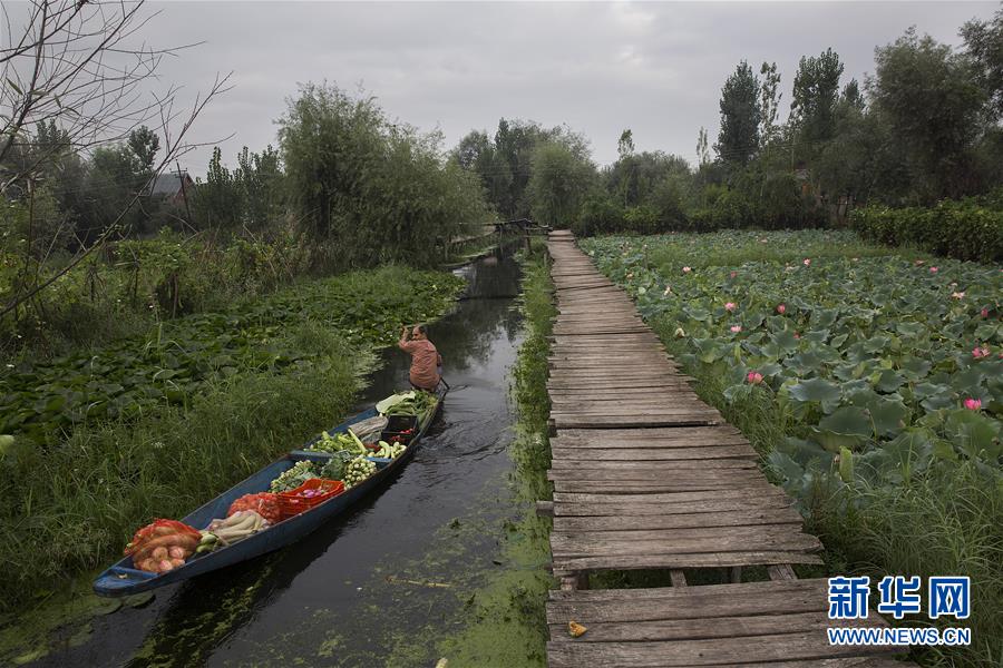 9月1日,在印控克什米尔斯利那加,商贩划船前往水上蔬菜市场交易。 新华社发(贾维德·达尔摄)