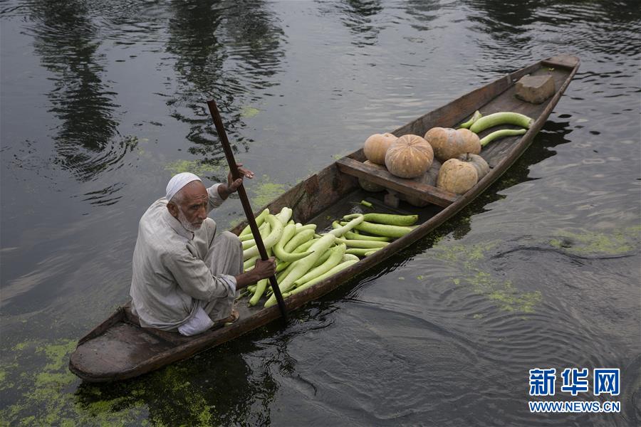 9月1日,在印控克什米尔斯利那加,商贩划船前往水上蔬菜市场交易。 新华社发(贾维德·达尔摄)