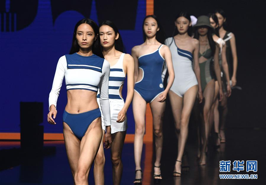 9月1日,模特在“泳享青春 不负未来”第五届互联网时尚设计大赛决赛上展示服装。 当晚,以“新锐力量——原力觉醒”为主题的东方时尚季·第20届中国(青岛)国际时装周落下帷幕。 新华社记者 李紫恒 摄
