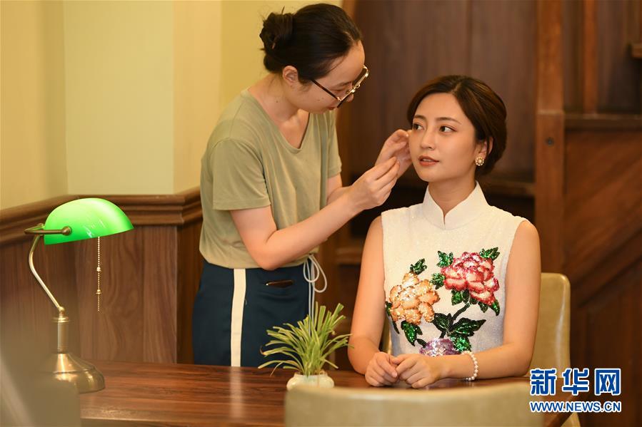 9月2日,一名模特(右)身着钱钟书设计的旗袍准备拍摄样照。 出生于1983年的杭州人钱钟书,在杭州南宋御街经营着一家旗袍铺,吸引了不少市民光顾。他从世界各地收集了几百卷老布料,饰以自己设计的绣花和珠宝,尝试做出更符合当代审美的旗袍。“我希望做出不拘泥于传统、有时代特色的设计。”钱钟书说。 新华社记者 翁忻旸 摄