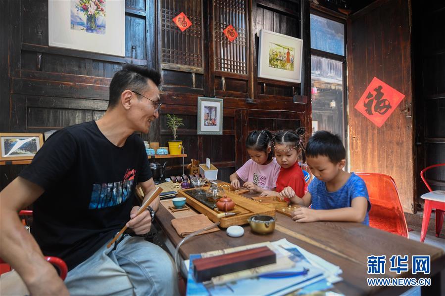 来自上海的水彩画创作者金钰琦(左)在石舍村租下的古宅里完成绘画授课后指导儿童下棋(9月5日摄)。 近年来,浙江省桐庐县以富春江镇的芦茨、茆坪、石舍三个村及严子陵、白云源两个景区为基点,以乡村传统要素为体验内容,打造总面积约62平方公里的富春江(芦茨)乡村慢生活体验区,并逐步形成一批特色民宿品牌。 新华社记者 黄宗治 摄