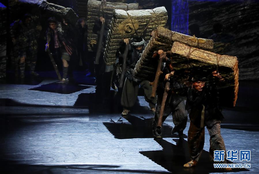 9月16日,演员在表演舞剧《川藏·茶马古道》。 当日,第十二届中国舞蹈“荷花奖”舞剧评奖演出在上海国际舞蹈中心大剧场揭幕。从16日开始,将有《川藏·茶马古道》《浩然铁军》《红旗》《骑兵》《努力餐》《彩虹之路》《石榴花开》《朱自清》8部舞剧上演,角逐“荷花奖”。 新华社记者 方喆 摄