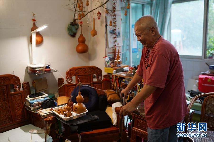 9月16日,刘振拄着拐杖在家中行走。 71岁的刘振居住在江西省南昌市青山湖区塘山镇高新社区,因为常年使用葫芦进行创作,他被人们亲切地称为”葫芦爷爷“。2004年,刘振在一次意外中脊柱受伤,之后大部分时间不得不待在家里。不甘寂寞的刘振尝试用烙铁在葫芦上进行创作,题材丰富多彩。如今,刘振已经创作了数千个葫芦,“葫芦爷爷”用葫芦创造了一个精彩的世界。 新华社记者 周密 摄