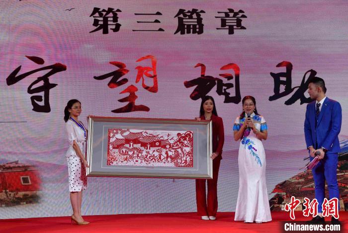图为非物质文化遗产剪纸传承人陈燕榕(右二)展示在活动现场创作的“居同厝?共守望”主题剪纸作品。 张斌 摄