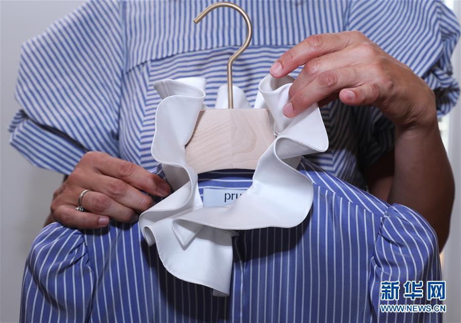 9月22日,法国设计师Prune Goldschmidt在巴黎展示同名品牌2021春夏新品中领口的独特设计。 在2021巴黎春夏时装周即将到来之际,9月22日,来自法国波尔多的年轻品牌Prune Goldschmidt在法国巴黎通过静态展示的方式推介其2021春夏新品。设计师Prune Goldschmidt在作品中融入了“口罩”元素。 新华社记者 高静 摄