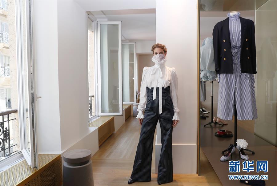9月22日,一名模特戴口罩在法国巴黎展示Prune Goldschmidt2021春夏新品。 在2021巴黎春夏时装周即将到来之际,9月22日,来自法国波尔多的年轻品牌Prune Goldschmidt在法国巴黎通过静态展示的方式推介其2021春夏新品。设计师Prune Goldschmidt在作品中融入了“口罩”元素。 新华社记者 高静 摄