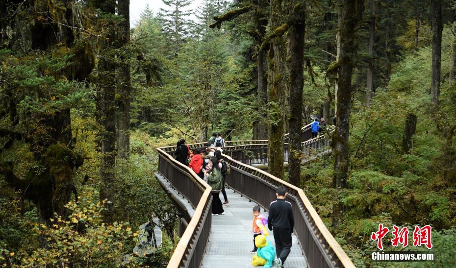 10月4日,“十一”黄金周进入第四天,游客在四川甘孜藏族自治州海螺沟原始森林中的步游道上游览。中新社记者 刘忠俊 摄