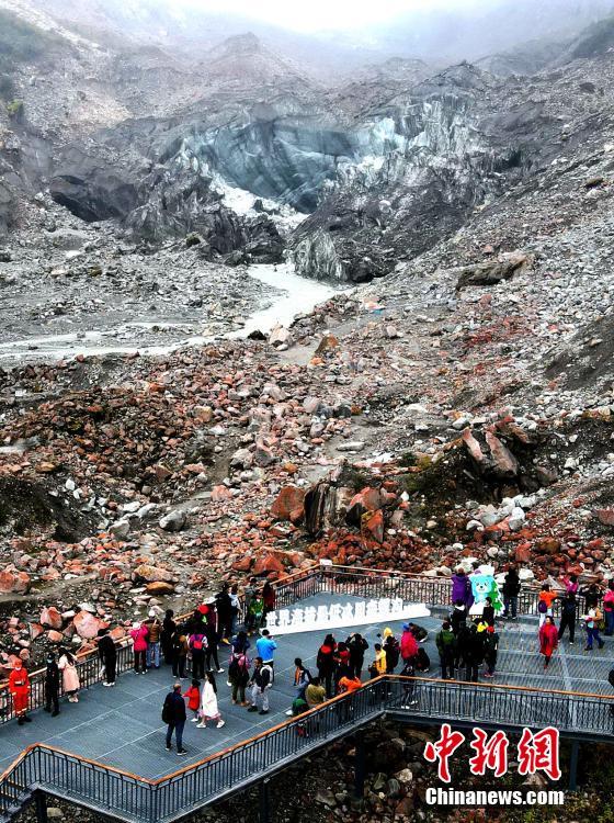 10月4日,“十一”黄金周进入第四天,四川甘孜藏族自治州海螺沟,游客在冰川观景平台上远眺海螺沟冰川。中新社记者 刘忠俊 摄