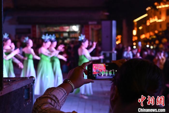 融安县骑楼文化广场举行非遗项目展演,现场观众用手机录像。 黄恋 摄