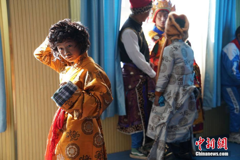 格萨尔史诗是联合国教科文组织非物质文化遗产。青海省杂多县第二民族完全小学自2016年起组建格萨尔文化传承班,这其中包括环保班级、格萨尔书法班级、哈达说班级等九种类型。图为10月14日,该校表演格萨尔史诗说唱艺术的小学生在台下休息。中新社记者 苏丹 摄