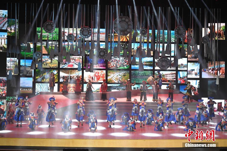 10月19日晚,由云南省普洱市打造的脱贫攻坚音乐舞蹈作品《宾弄赛嗨》在普洱大剧院正式演出。“宾弄赛嗨”是傣语,意为“没有血缘关系但像亲戚一样的朋友”,是普洱各民族间互帮互助的优良传统。中新社记者 刘冉阳 摄