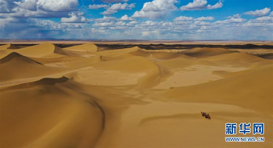巴丹吉林沙漠风光(10月15日摄,无人机照片)。 巴丹吉林沙漠位于内蒙古阿拉善高原中心,高大的沙丘在秋日的映衬下焕发出金色的光泽,美不胜收。 新华社记者 连振 摄