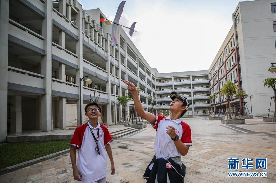 10月26日,北京师范大学海口附属学校的学生放飞航模。 当日,北京师范大学海口附属学校举行第三届科技人文节活动,在校内营造爱科学、学科学的良好氛围。 新华社记者 张丽芸 摄
