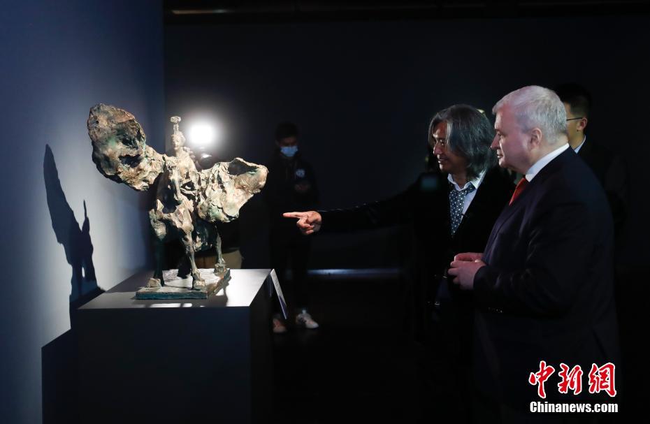 10月29日,俄罗斯驻华大使安德烈?杰尼索夫在北京国家大剧院参观“中华文脉 写意之美——吴为山中华历史文化名人雕塑作品展”,中国美术馆馆长吴为山导赏。展览主要展出了吴为山历经30余年积累创作的中华历史文化名人雕塑70余件。这些雕塑作品通过对历史人物意象性的塑造,展现出中国文化深层的内在精神与文化底蕴。图为吴为山(左)与安德烈?杰尼索夫在展厅交流。中新社记者 杜洋 摄