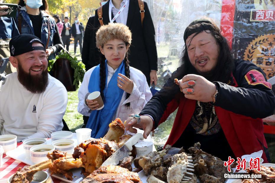 11月1日,食客品尝特色美食。当日。第二届“西贝那达慕·草原美食节”在北京开幕,现场的美食集市、搏克比赛、歌舞表演、亲子游园会等活动吸引众多市民参加。中新社记者 李慧思 摄