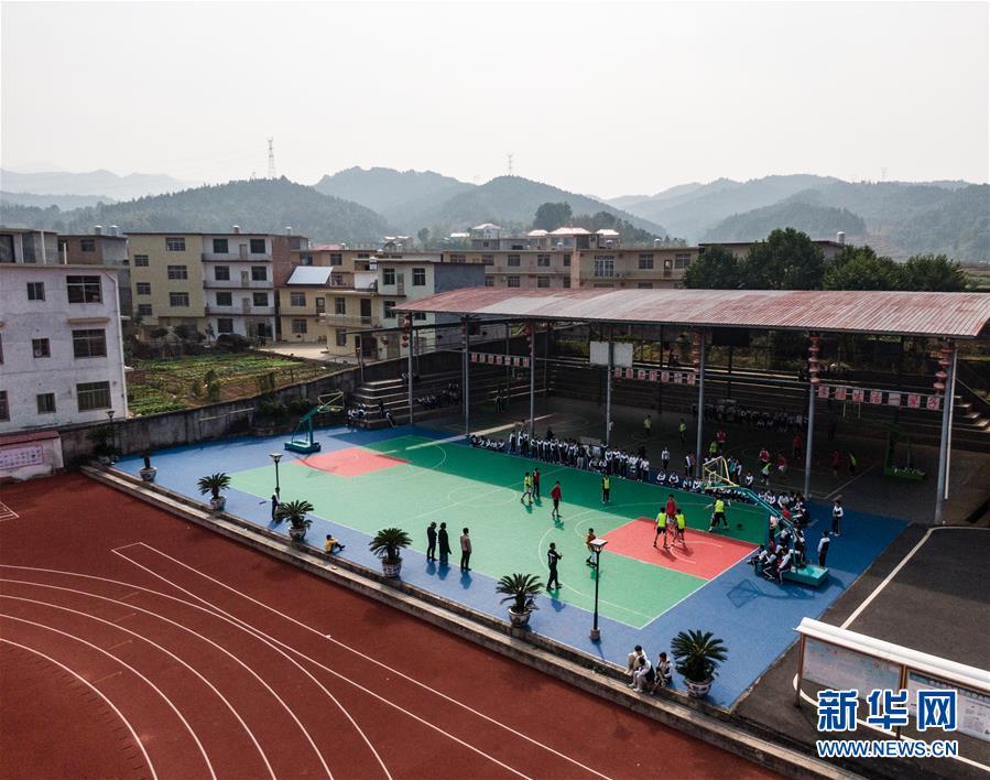 11月3日,曾红和学生们在球场上运动(无人机拍摄)。 新华社记者 胡晨欢摄