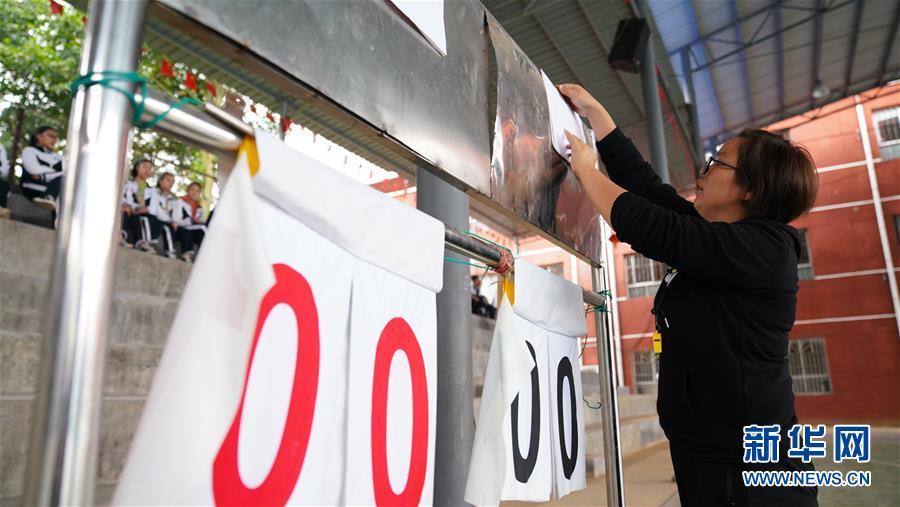 11月2日,曾红准备篮球对抗比赛的计分板。 新华社记者 胡晨欢摄