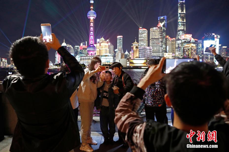 11月4日晚,新版进博会主题光影秀在上海黄浦江两岸上演,上海用五彩斑斓的灯光和悠扬炫动的音乐迎接第三届中国国际进口博览会如期举办。图为民众在外滩滨江步道上与光影秀合影留念。 殷立勤 摄