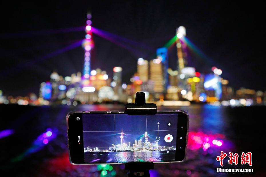 11月4日晚,新版进博会主题光影秀在上海黄浦江两岸上演,上海用五彩斑斓的灯光和悠扬炫动的音乐迎接第三届中国国际进口博览会如期举办。图为上海浦江两岸上演进博会光影秀。 殷立勤 摄