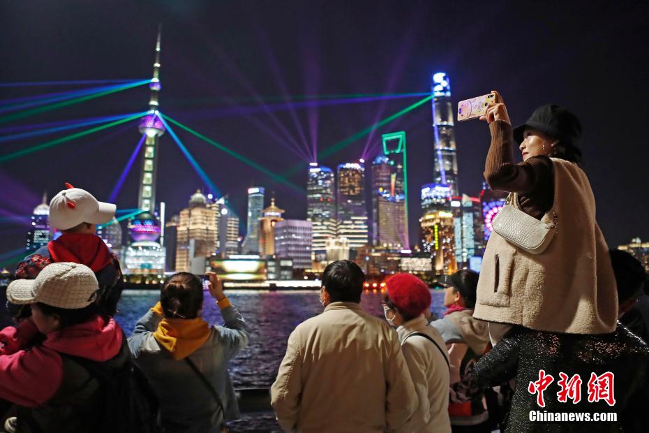 11月4日晚,新版进博会主题光影秀在上海黄浦江两岸上演,上海用五彩斑斓的灯光和悠扬炫动的音乐迎接第三届中国国际进口博览会如期举办。图为游客用手机拍摄进博会光影秀。 殷立勤 摄