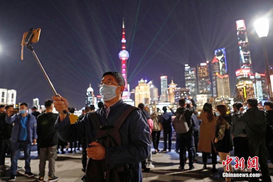 11月4日晚,新版进博会主题光影秀在上海黄浦江两岸上演,上海用五彩斑斓的灯光和悠扬炫动的音乐迎接第三届中国国际进口博览会如期举办。图为游客用手机拍摄进博会光影秀。 殷立勤 摄
