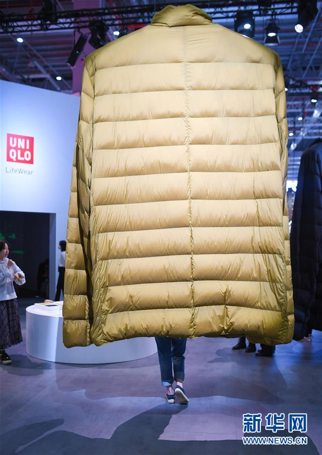 11月7日,一名观众在进博会消费品展区优衣库展台的巨型羽绒服后拍照。新华社记者 李任滋 摄