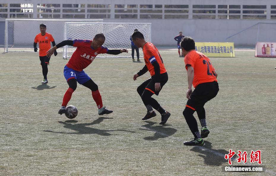 11月8日,两支球队正在西宁市西门体育场进行比赛。昨日,2020年度西宁地区首届中老年(40岁以上)足球联赛(八人制)鸣哨开赛,共有9支足球队的200余名足球爱好者参赛。本届赛事为期两个月,将展开8轮36场的较量,为广大中老年足球爱好者相互沟通、交流的平台。中新社记者 马铭言 摄
