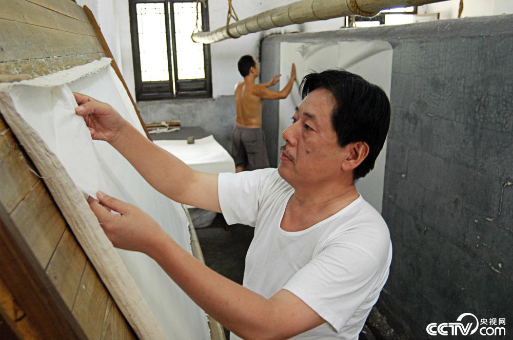 捞好的纸先要压榨水分,但也要保证一定的湿度。第四步晒纸是手艺活儿,也是苦差事。将润湿后的纸用刷子上下一挥,左右一抹放在“火墙”之上。火墙将宣纸迅速烘干,同时也将捞纸过程中的猕猴桃藤汁蒸发掉,以免纸张日后发黄。