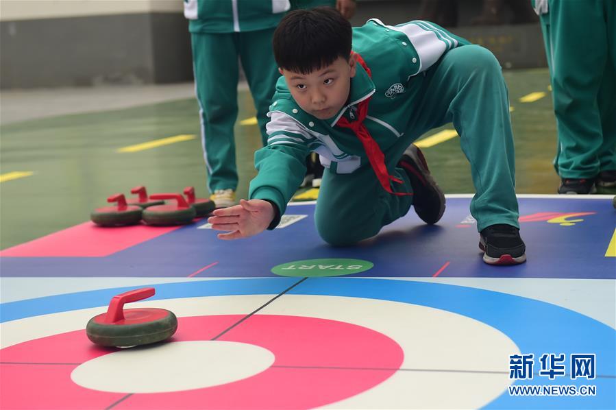 11月17日,沧州市实验小学的学生进行陆地冰壶训练。 近年来,河北省沧州市持续推进“冰雪运动进校园”活动,将陆地冰壶、轮滑等旱地冰雪运动引入学校,培养青少年的参与热情。 新华社发(傅新春 摄)