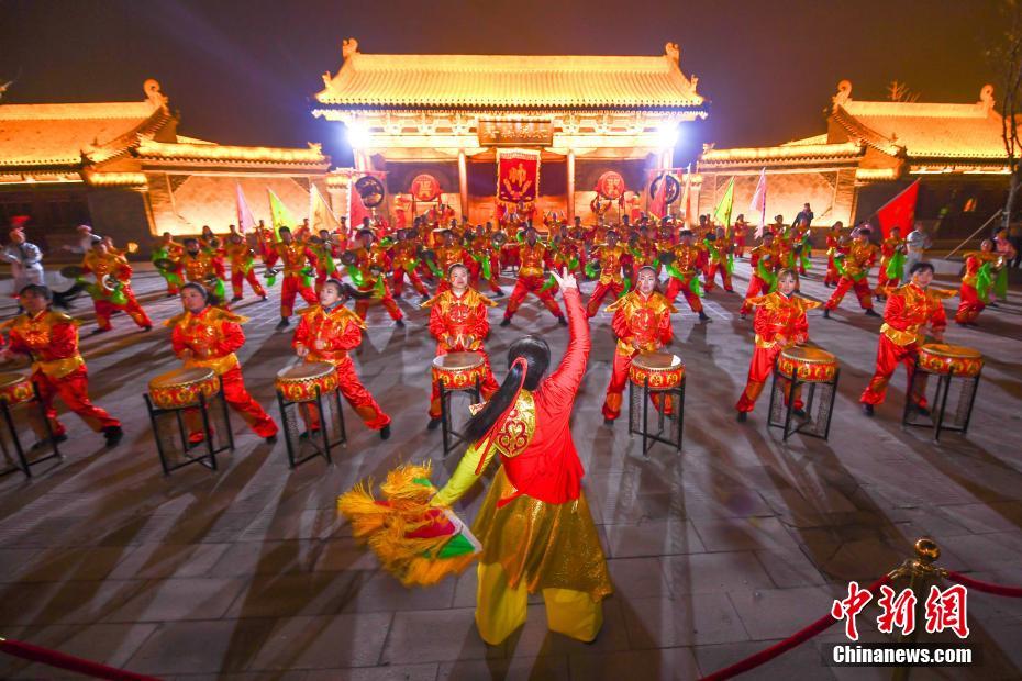 11月23日晚,山西太原,太原古县城内威风锣鼓表演吸引游客。位于太原市晋源区的明太原县城建于1375年,2011年被列入中国国家级历史文化街区,当地政府于2012年启动复兴工程。目前,明太原县城复建工程基本完成,古城风貌即将再现。中新社记者 武俊杰 摄