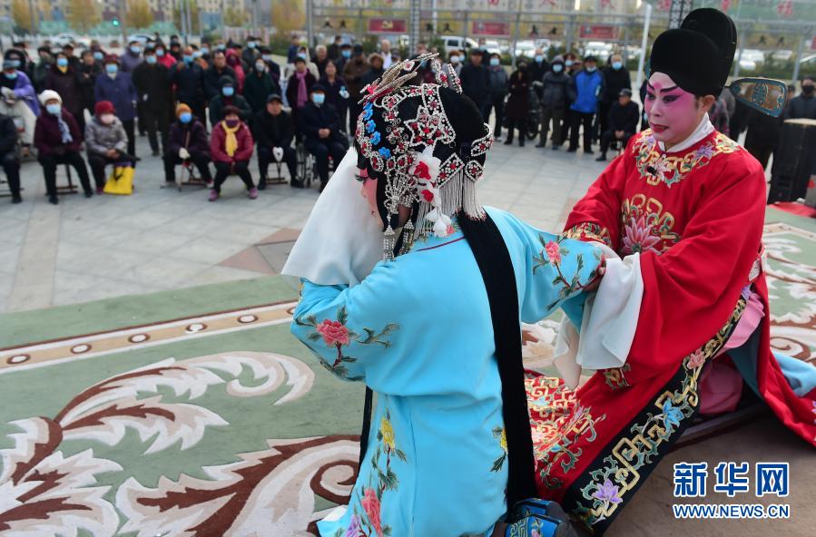 11月24日,在沧州市新华区鼓楼社区,沧州河北梆子剧团的演员在演出河北梆子《陈三两》。