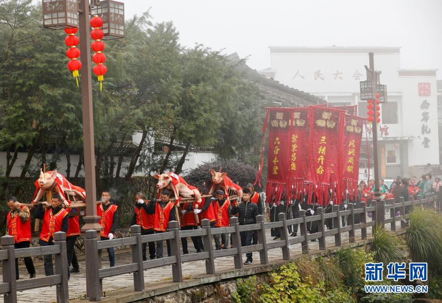 11月29日,景宁畲族自治县大漈乡大漈村村民参加抢猪节巡游活动。