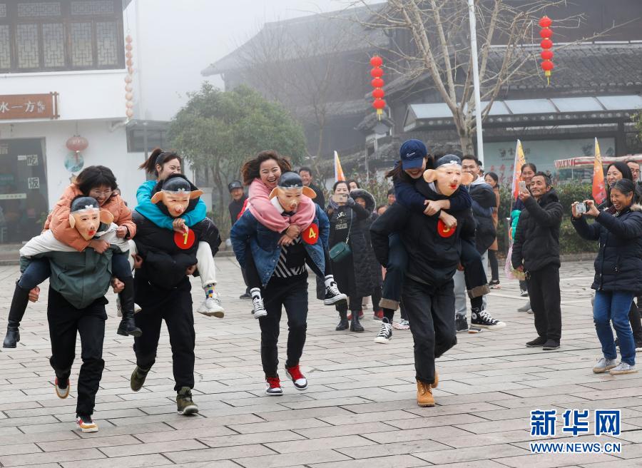 11月29日,在景宁畲族自治县大漈乡大漈村活动现场,人们在参加“小猪背媳妇”娱乐活动。