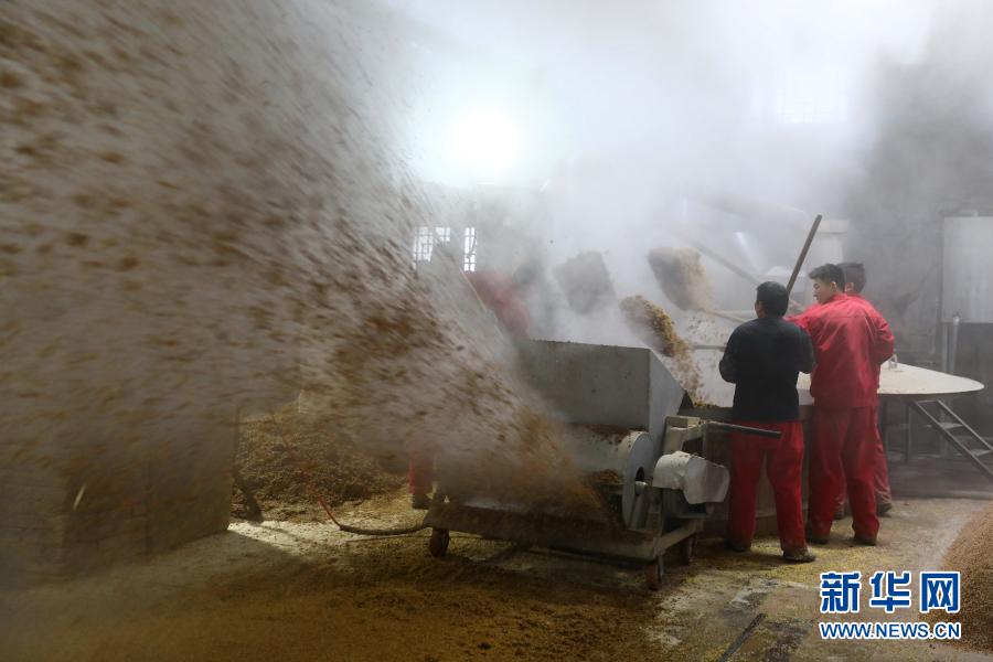11月28日,工人在安徽省濉溪县一酒企的酿酒车间忙碌。