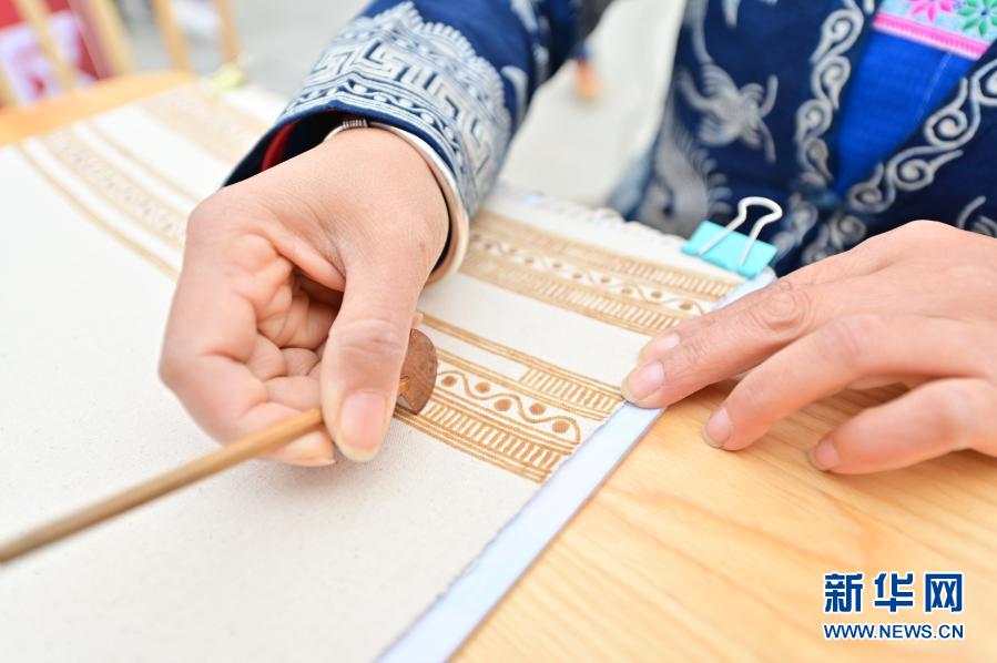 11月29日,蜡染艺人在贵州省从江县周末非遗扶贫集市上展示蜡染技艺。