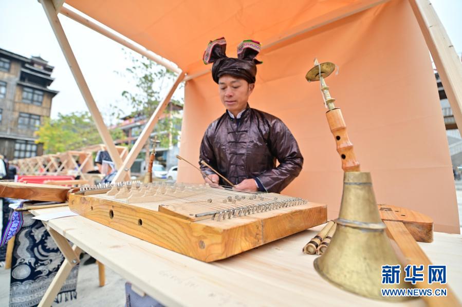 11月29日,侗琴制作艺人在贵州省从江县周末非遗扶贫集市上展示侗琴演奏。