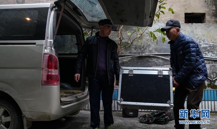 12月2日,马俊寿(右)和同事一起搬运电影设备,准备下乡为村民播放电影。新华社记者 胡晨欢 摄